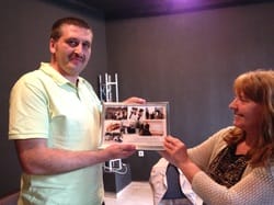 на снимката: Илка Дончева, член на УС на АОЦ, подарява от името на членовете и доброволците колаж от снимки, съдържащ моменти от гражданските инициативи с участието на Стоян през годините.
