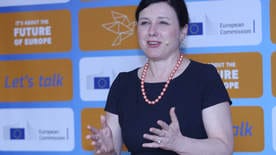(Обръщението на Михаела Джоргова от Асоциация общество и ценности към еврокомисар Йоурова, по време на състоялата се обществена дискусия.)