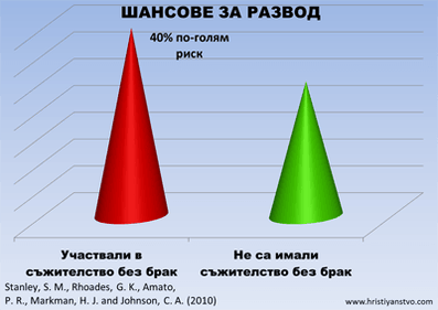 „Двойките, съжителстващи преди брака, съобщават за повече проблеми и са по-склонни да мислят за развод. Това е тъкмо обратното на онова, което бихте очаквали.”[8]