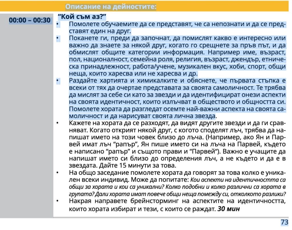 “Кой съм аз? Помолете обучаемите да си представят, че са непознати и да се представят един на друг.Поканете ги преди да започнат да помислят какво е интересно и важно да знаят за някой за друг, когато го срещнете за първи път… Например: име, възраст, пол, националност, семейна роля, религия, възраст, джендър,етническа принадлежност..” стр. 73