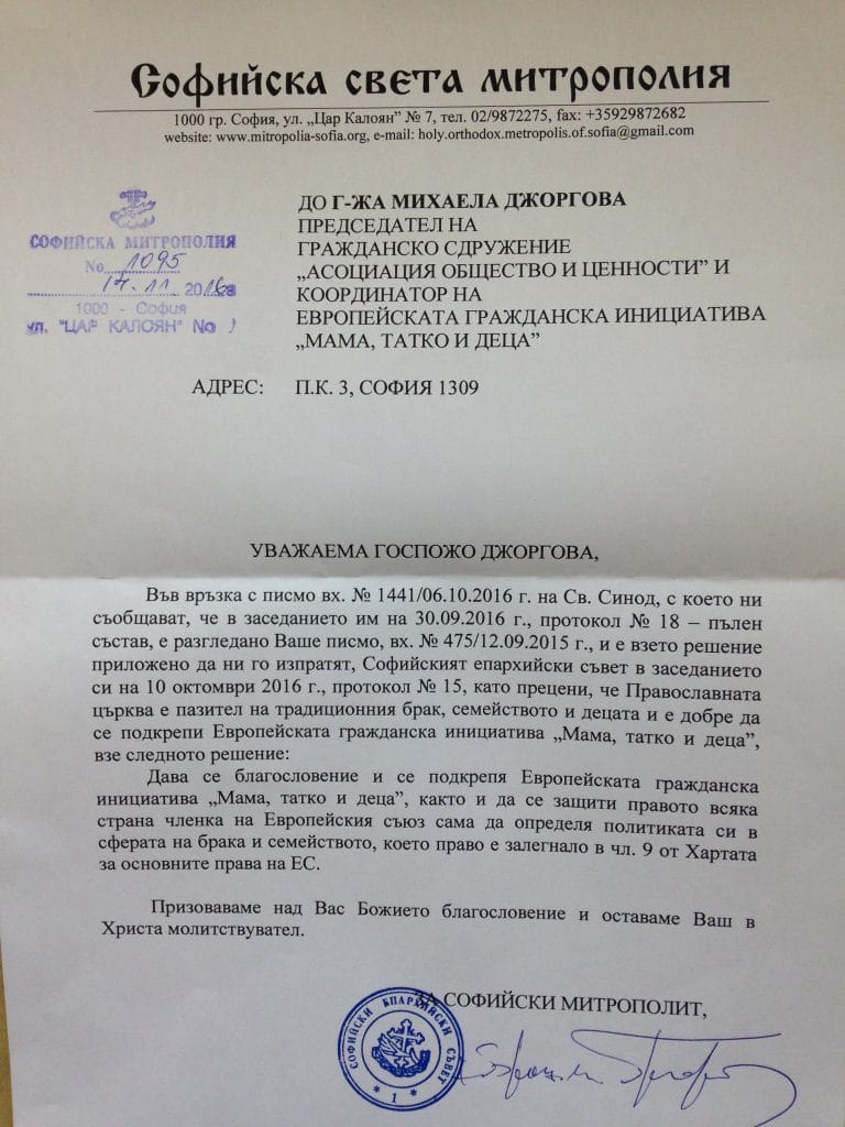 София, 19.11.2016г. Българският патриарх даде своята подкрепа и благословение на Европейската гражданска инициатива “Мама, татко и деца”. Тя цели да защити децата, брака и семейството в Европейския съюз, като поиска приемането на единни дефиниции за брак и семейство: бракът да бъде дефиниран като съюз между един мъж и една жена, а семейството – основано на брак и/или потомство. Тези определения ще важат за общите документи и директиви на ЕС и няма да променят определенията за «брак» и «семейство» в националните законодателства.