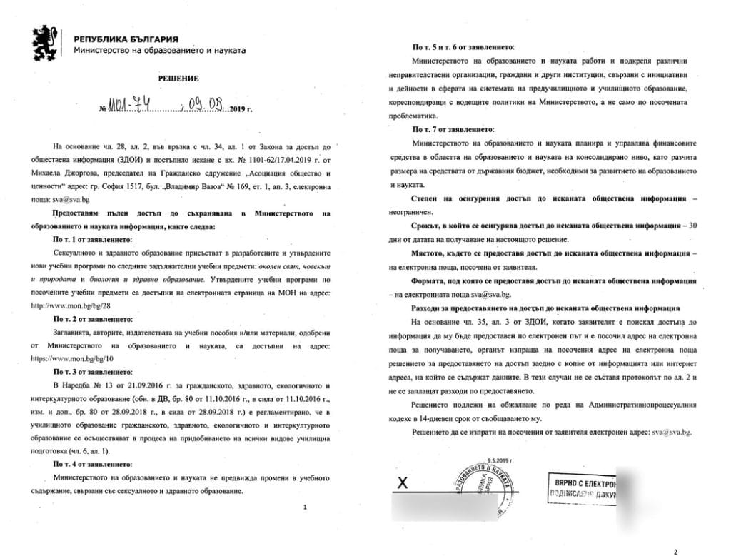 Това стана ясно от отговора на Министерство на науката и образованието (МОН), на запитване на сдружение “Асоциация общество и ценности”, по Закона за достъп до обществена информация.